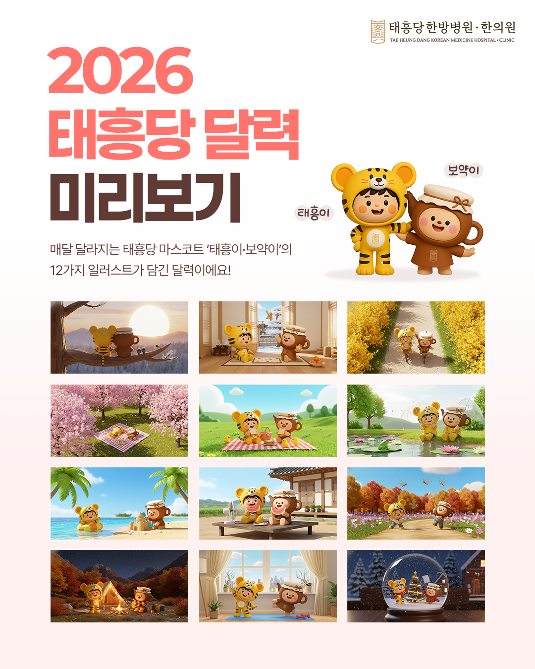 태흥당의 마스코트 ‘태흥이’와 ‘보약이’의 12가지 일러스트가 담겨 있어요.